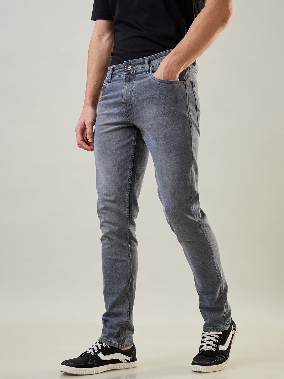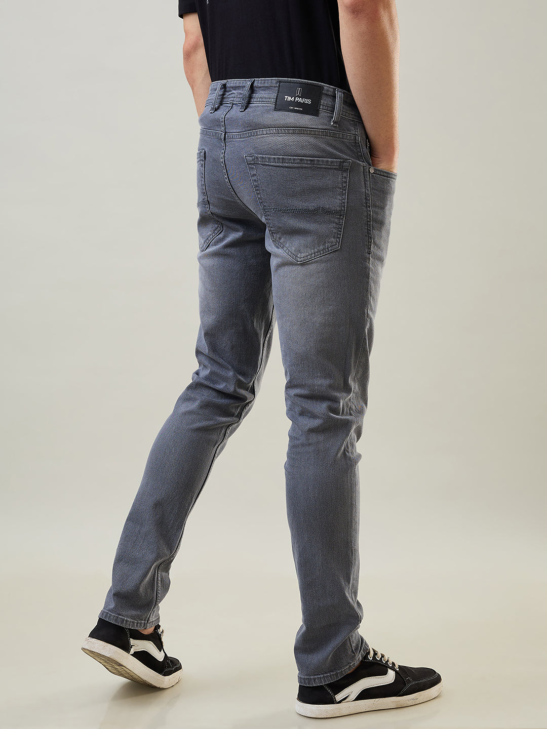 Tim Paris Mens Medium Grey Solid Jeans In Cotton Blend With A Ferdinand Slim Tapered Fit. These jeans blend comfort With Style Effortlessly.