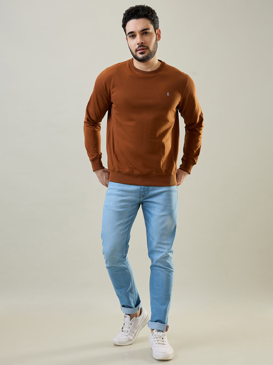 With its classic round neck and full sleeves, this solid brown sweatshirt provides a sleek, casual look. Its neutral color makes it easy to pair with any bottom, whether you're wearing jeans, joggers, or shorts. Whether you're relaxing at home or heading out for a casual outing, this piece guarantees both style and comfort.